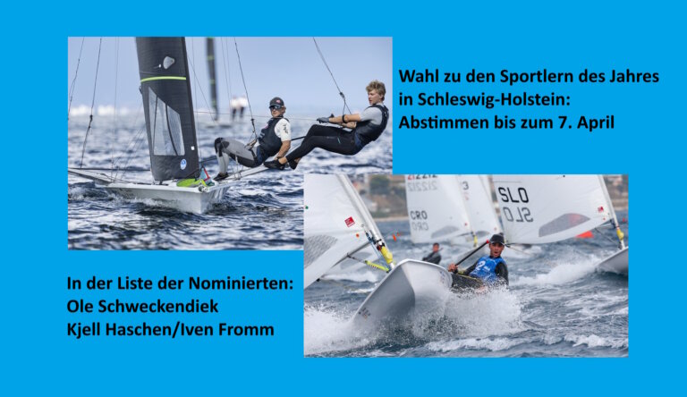 Zum Kreis der Nominierten gehören auch die erfolgreichen Junioren-Segler des Segler-Verbands Schleswig-Holstein. Ole Schweckendiek steht als Junioren-Weltmeister der Ilca/ bei den Sportlern zur Wahl, das 49er-Team Kjell Haschen/Iven Fromm (Junioren-Weltmeister) bei der Mannschaft des Jahres.